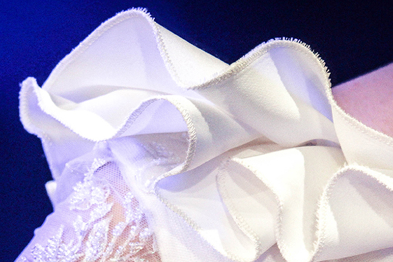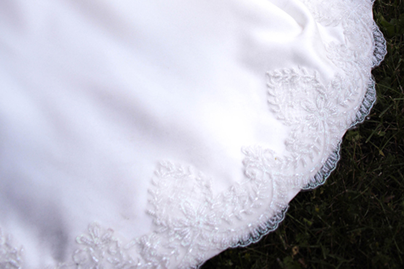 Il fondo dell’abito è arricchito dal bordo smerlato dello stesso tulle ricamato utilizzato per le maniche e l’esterno del corpino.