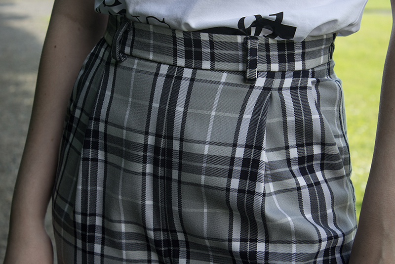 Realizzati in viscosa scozzese a quadri bianchi blu e grigi. Dalla linea a palazzo con risvolto sul fondo, presentano sul dietro delle tasche a filetto, sul davanti sempre tasche in silesia rifinite con bordino.